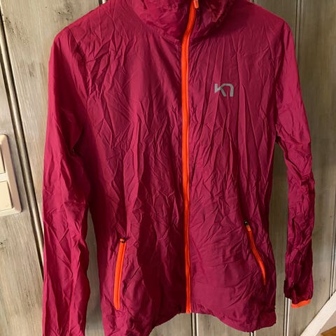 Kari Traa Løping Jakke for kvinner i størrelse M. Jakken er svart med røde detaljer, laget for løping og andre sportsaktiviteter. Materialet er designet for å gi komfort og funksjonalitet under trening.