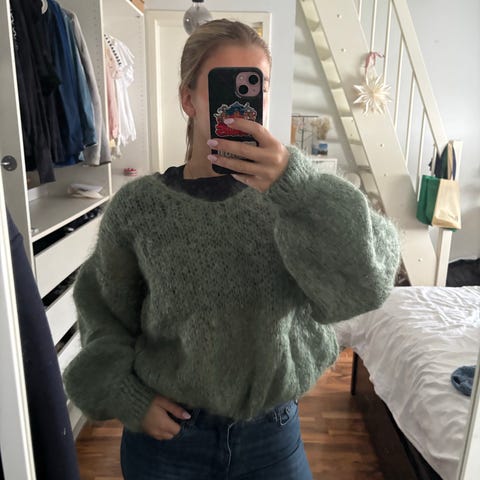 Vel å selge gensaren frå ilag då den ikkje blir brukt lenger. Eg kjøpte gensaren via second chance på Tise for 4 år sidan, for 1200kr, modellen er Tjeld sweater. Storleiken er S/M, men den er nok meir som M. Men den er noko oversized, og vil fint passe frå small til large, alt etter kva ønska passfor er. Gensaren er lys blå, med herlig ullkvalitet (mogelegens mohair?) som er deilig mjuk, med V-utringing og store ballongermer som samlast inn med mansjett i ermet. Den er kort modell som når ned til hoftene. Fargen er mest realistisk på dei to første bileta. Gensaren er fint brukt, og har ingen bruksmerker.