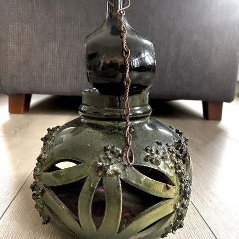 Høyde 18cm , diameter 11cm. Det er hull øverst til å feste et opphen i Kr 425