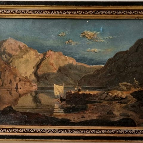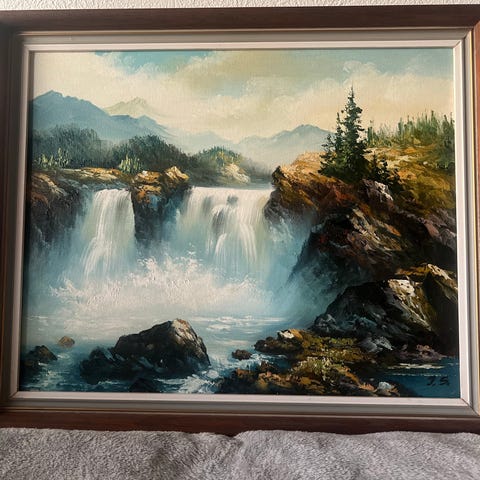 S. Næsheim landskapsmaleri i olje på lerret. Maleriet viser en naturscene med fjell, trær og elv. Inkluderer en ramme i tradisjonell stil. Signert av kunstneren S. Næsheim