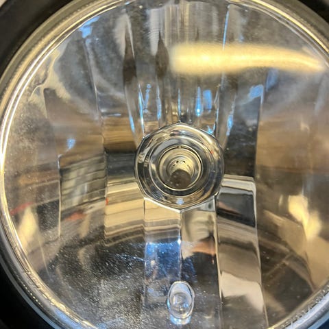 Frontlykter sett bestående av to runde lykter (fjernlys) med kromdetaljer og integrerte LED-elementer.