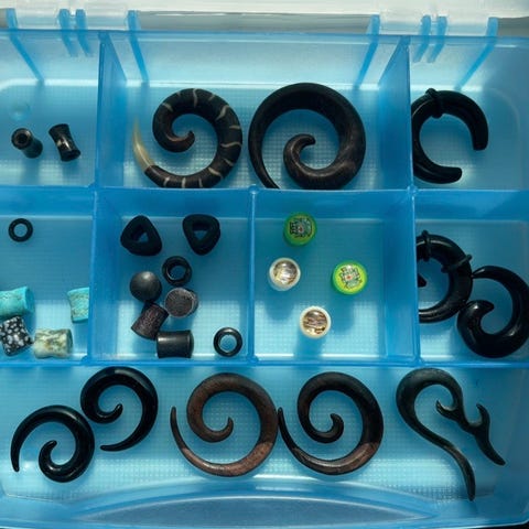 Piercingsmykker kjøpt til bruk i helix. De fleste er nye, noen er prøvd. Renset etterpå.