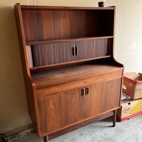 Vises delvis demontert: 3 skapseksjoner med henholdsvis hyller, skuffer og glassdører + tallerkenhylle + 3 faste hyller + 3 veggfester. Vennligst se bildene. Bør hentes Røros.