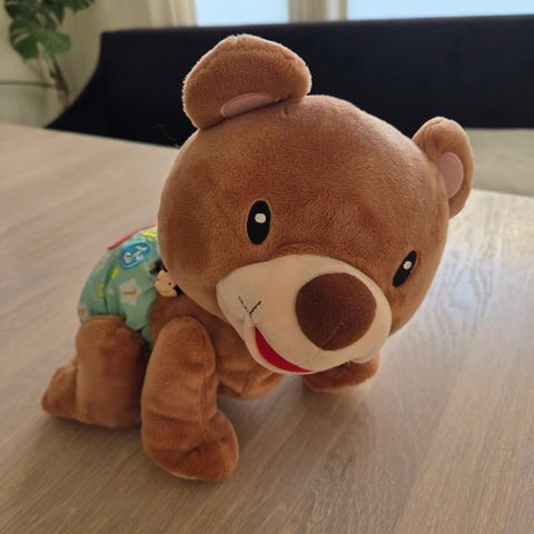 Vtech krabbebamse kjøpt ny av oss. Fungerer som den skal. Svært pent brukt. Veldig fin leke til de minste. Batteri følger med. Alle knapper, lys og lyd fungerer som det skal.