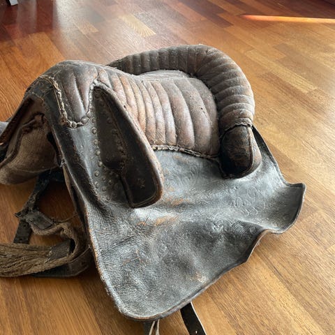 Et par gamle klassiske ridestøvler i brunt skinn med flotte støvelstrekkere/ støvelblokker i massiv heltre. Støvlene er generelt hele og fine, men man kan se at de har vært brukt før de endte opp som pyntegjenstand. Noe de minst har vært de siste 20 årene... Ukjent alder. Flotte støvler med knotter/nagler på undersiden av sålene. Støvelstrekkerne et i massivt lakkert treverk. Antagelig engelske/britiske da de er merket med L og R. Ingen størrelse oppgitt, men antar det er rundt 40-41. Så antagelig herrestøvler. Kan hentes eller sendes mot postens satser. Tar Vipps.