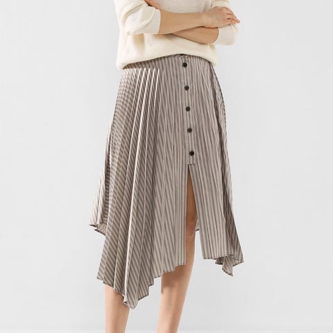 Skjørtet har en frontglidelås i oransje og er laget i et materiale som gir en strukturert overflate.