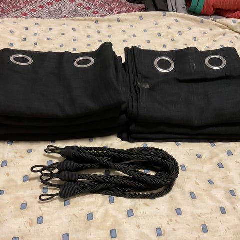 To stk lengder pent brukte tykke velour gardiner i mørk blå fra Home&Cottage.