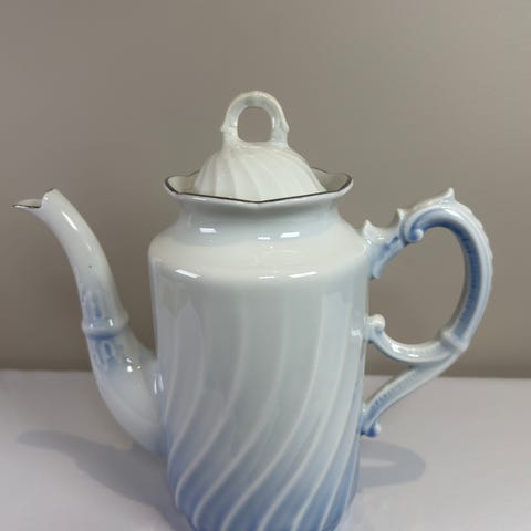 Kaffekanne fra Porsgrund Porselænsfabrik, modell Bogstad «Maud», i hvitt porselen med blå nyanser.