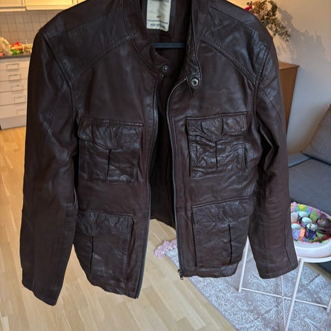Selger en brun jakke i falskt lær (polyester). Ser veldig bra ut og ser nesten ikke brukt ut. Ingen synlige skader eller slitasje. Passer perfekt til en clean streetwear/look og kan brukes til både hverdags og finere anledninger.