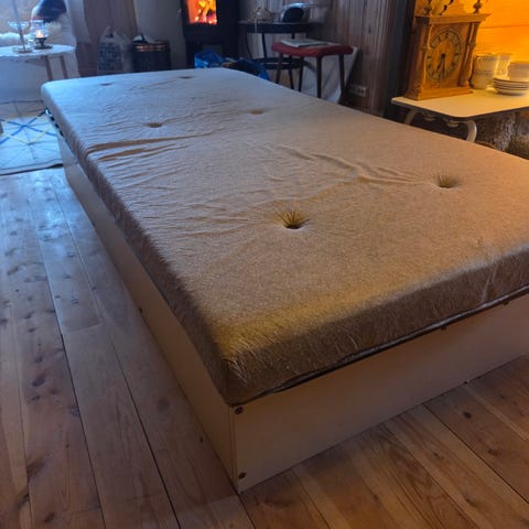 To gamle enkelt senger. Skal i utgangspunktet stå som en dobbetseng. 75 x 200 cm. I flammebjørk. Bilde av gavel og ende. Uten madrass. Må vaskes.