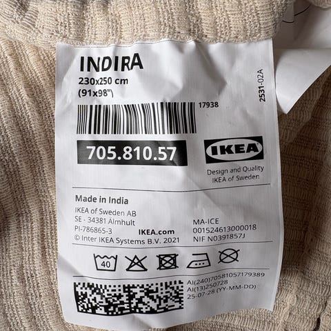 IKEA- teppe laget av ren ull med et mønster av blå, oransje, gule og brune sting på en kremhvit bakgrunn. Teppe med myk tekstur, egnet for bruk i stue eller soverom som dekorativt element eller for ekstra varme.