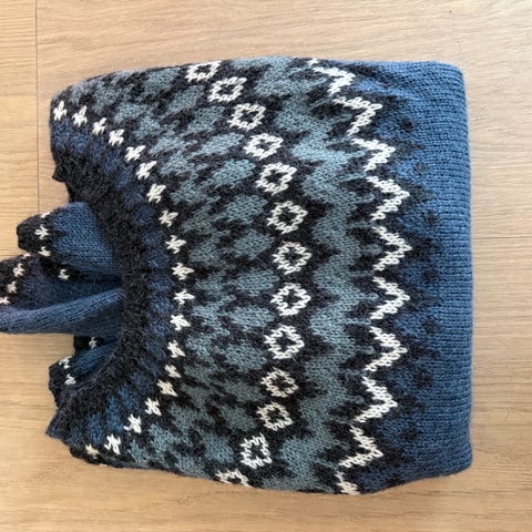 2 flotte håndstrikka Mariusgensere i 90-tallsstil. Blå er strikket i Peer Gynt, grønn i Triplex