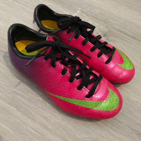 Nike fotballsko for barn i størrelse 31,5. Skoene er oransje med svarte og sølvfargede detaljer. De har borrelås og snøring for justerbar passform. Sålen har knotter for bedre grep på gressbaner. Skoene er hele og fine, men har noen merker etter bruk.