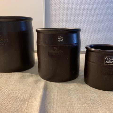 Gamle vakre pent brukte syltekrukker Trolig produsert på Sandnes. Den ene står det 1L under den andre rommer 9 dl. Kr 250 pr stk