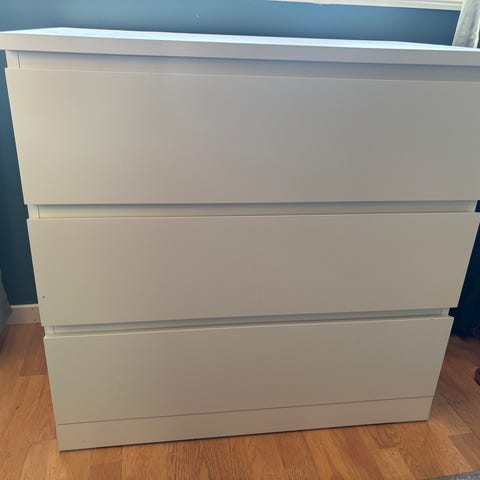 Fin Ikea kommode med glassplate pá toppen - ett merke i en av skuffene etter hårkur - påvirker ikke bruken. Skuffene fungerer som de skal.