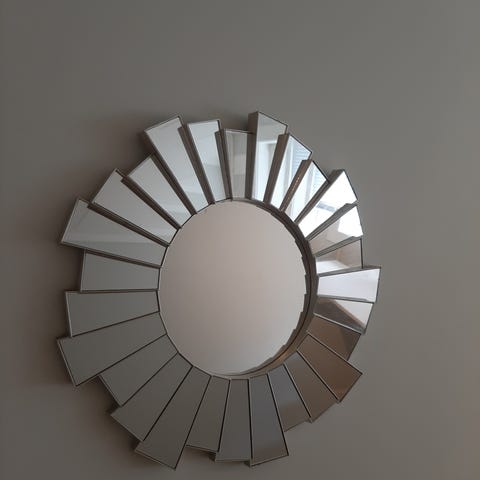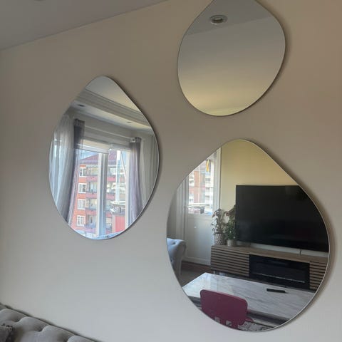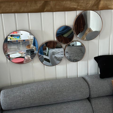 Brosté Copenhagen veggspeil med fem runde speil i forskjellige størrelser. Speilene er festet på en svart metallramme med veggfester på baksiden. Designet er moderne og minimalistisk, egnet for dekorasjon og funksjonell bruk i hjemmet. Selges pga av flytting lengde: 94, bredde 45