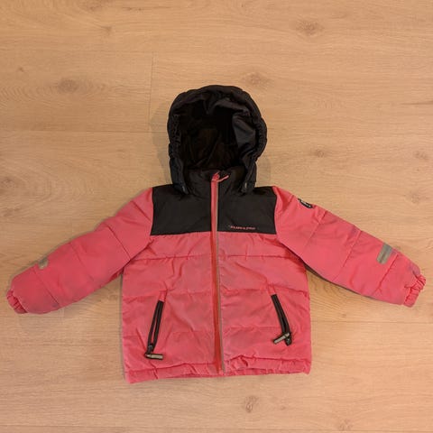 Polarn O. Pyret jakke i størrelse 104 for jenter. Jakken er rosa og laget med vanntett materiale med en vannmotstand på over 10 000 mm. Den har fullt tapede sømmer, er vindtett, pustende med over 5000 g/m²/24t, og vannavstøtende. Jakken har resirkulert fôr og reflekterende detaljer for økt synlighet. Tilstanden er som ny.