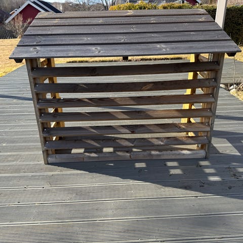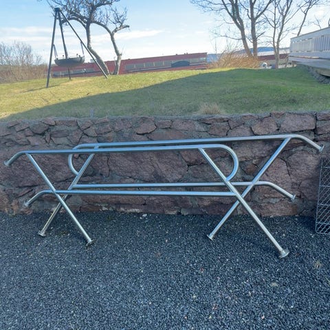 Skistativ for utendørsbruk. Stativet er laget av impregnert tre og metall, med en kombinasjon av naturlig trefarge og svart metall. Det er designet for å stå stabilt på bakken, med flere metallstenger som kan brukes til oppheng eller støtte. Egnet for oppbevaring av ski på vinteren og sykler om sommeren.