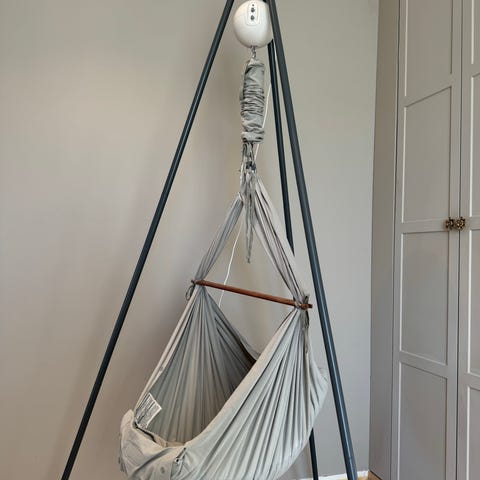Moonboon slungevugge med motor 2.0, stativ og karmbeslag til å henge i dør(ubrukt) selges for 4500 kr.
