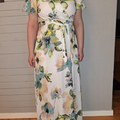 Cream Maxikjole crHalley Festkjole i beige farge, størrelse 42. Kjolen har et langt snitt med blomsterprint. ( ny pris kr.1599 ) brukt en gang i bryllup. Kan sende i posten. Eg spanderer porto!