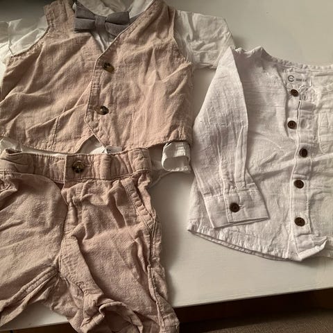 Et dresset sett med body og bukse i myk bomullskvalitet. Langermet body med en fastsydd vest og sløyfe. Bukse i lett, myk kvalitet med elastikk i midjen.