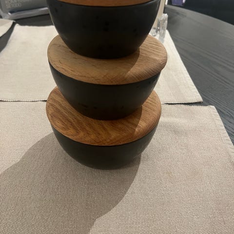 Fire små metallbokser med dobbelt lokk fra Whittards i London. Beregnet på te, men kan også brukes til å oppbevare småting.