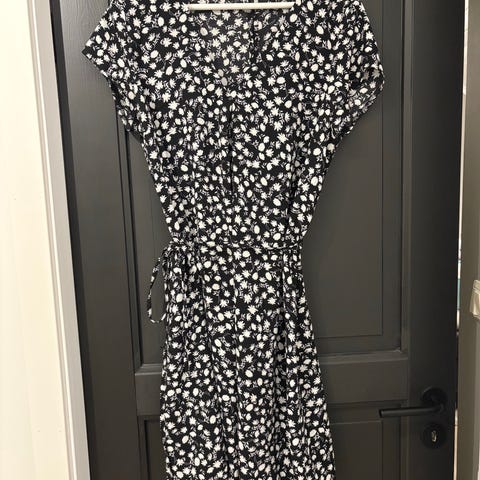 Vila-kjole i størrelse L, blå farge med mønster av små blad i gull. Kjolen har elastisk midje og er laget av lett materiale.