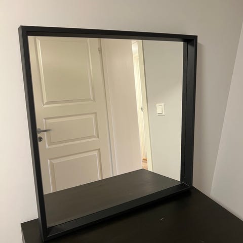 Selger et pent brukt speil produsert av Saint Gobain Glass. Selve speilmodellen er Miralite Revolution som er et blyfritt speil. Mest sannsynlig kjøpt hos Vedum.