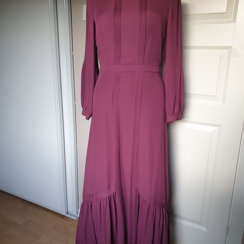 Kjolen har kort erme og rund hals. Glidelås bak. En diskret skrå splitt foran.