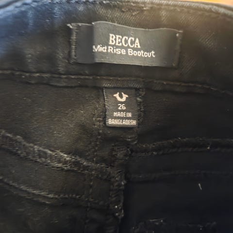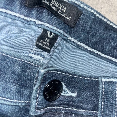True Religion Becca Mid Rise Bootcut Jeans i mørkeblå farge. Størrelse W27, tilsvarende damestørrelse M. Jeansene har en bootcut passform og mid-rise midje.