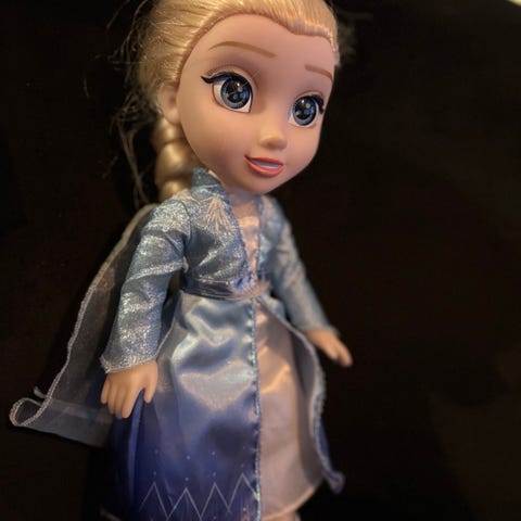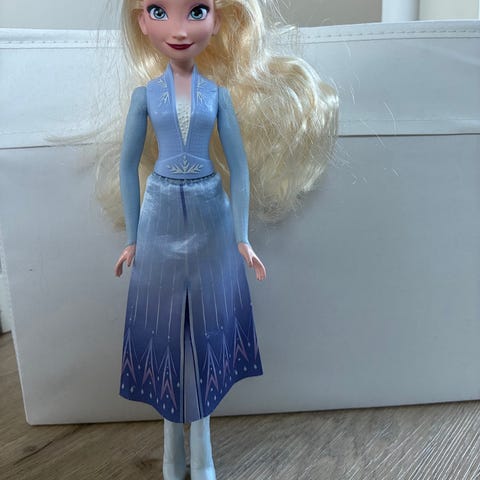 Disney Elsa dukke med hvit og lilla kjole. Dukken har langt blondt hår og detaljerte klær med mønster i blått og lilla. Passer som lekefigur for barn.Den har også musikk/lyd
