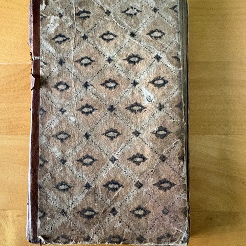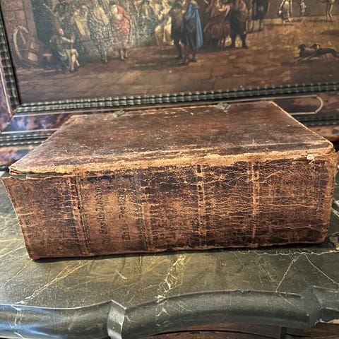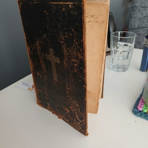 Daniel March Bok Bibelske Sande med tekst på dansk. Inneholder flere kapitler og avsnitt som omhandler bibelske temaer. Boken har et slitt omslag i lær og viser tegn på alder og bruk.
