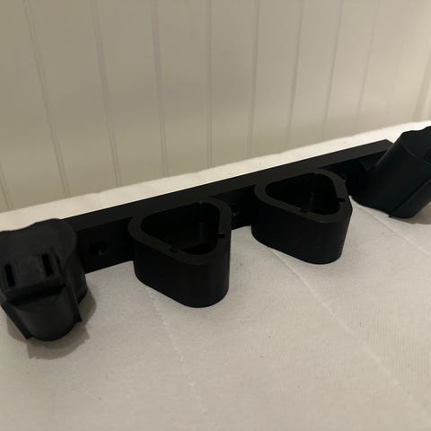 Holdere til Milwaukee M12 batteri og M12 verktøy. Svart farge. Holdere er 3D printed med PETG materiale.