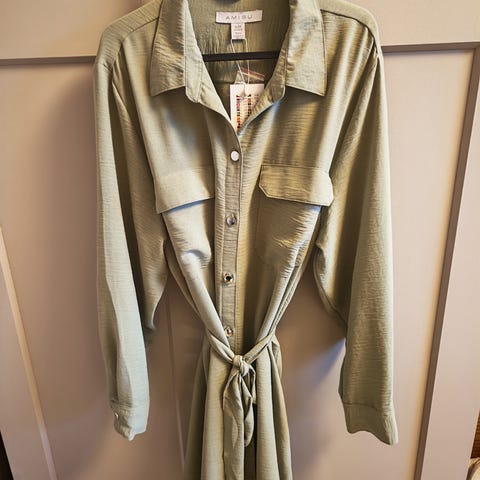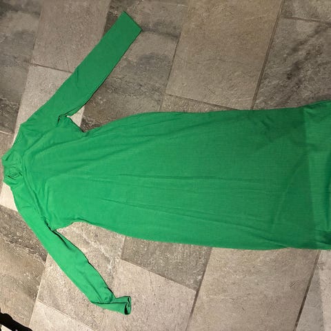 Noisy May hverdagskjole i grønn farge, størrelse 44 for kvinner. Kjolen har belte i midjen og langermet design. Materialet er ikke spesifisert, men kjolen har en enkel og komfortabel passform egnet for hverdagsbruk.