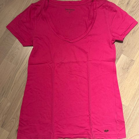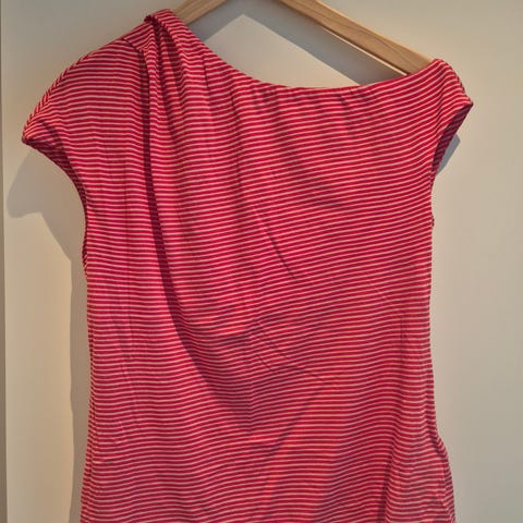 Denne toppen/T-skjorten er lite bukt og nesten som ny. Den er av merket Armani Exchange, som er en urban underlinje av det kjente italienske motehuset Giorgio Armani. Merket kombinerer streetwear-inspirert design med klassisk italiensk eleganse. Toppen er i et stretchlignende stoff som gjør at den føyer seg pent etter kroppen. Den har sømmer i front og bak som svinger innover mot livet og skaper en flatterende silhoutte. Over utringingen strekker det seg to bånd som skrår effektfullt over brystet og samles i et metallmerke hvor det står Armani Exchange.