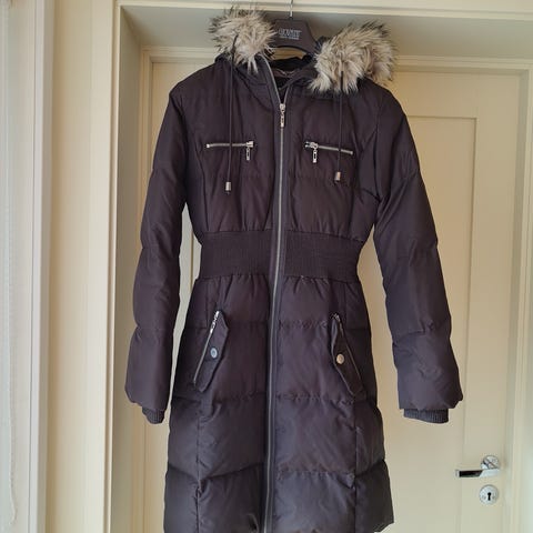 Dunjakke (80% dun og 20% fjær) fra Junge med hette i kragen, 2 lommer inne i jakken, 2 ute. Har litt glans i stoffet. Det er ikke en knall oransje farge. Det svarte strikket som man ser på baksiden for å justere vidden rundt live er ødelagt.