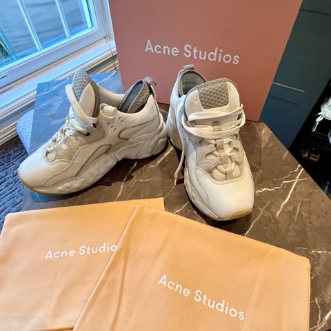 Acne Studios Sneakers joggesko i størrelse 38. Skoene er svarte og laget av materialer som inkluderer semsket skinn og tekstil. Designet for hverdagsbruk med snøring foran og en tykk såle for komfort og støtte. Store i størrelsen. Svært lite brukt.