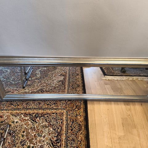 Speil av ukjent forhandler 130.6 x 40.3 x 2.3cm. En lite sprekk i hjørne som synes på bildet. Enkelte små svake svarte merker her og der på karmen om man ser nøye etter. Glasset er helt og fint. Generelt i god stand. Rektangulært smalt speil.