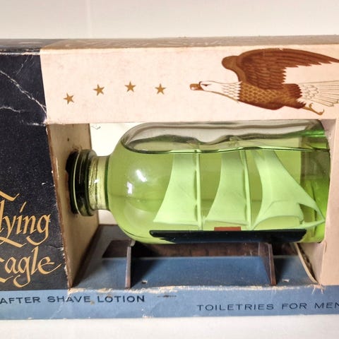 Vintage aftershavelotion i glassflaske formet som en retrobil.