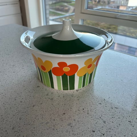 Kasserolle i retro stil fra Høyang- Polaris på 3,5 l. med lokk. Det er noen bruksmerker i bunnen av kasserollen. Må hentes av kjøper eller kjøper må betale for frakt.