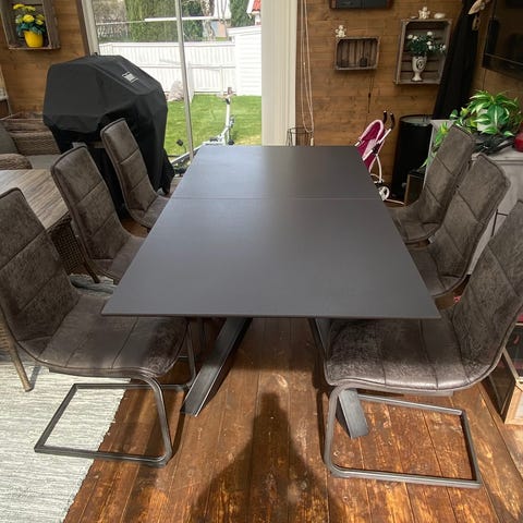 Fint brukt spisebord fra A-møbler til salgs. Bordet er i veldig fin stand. Stolene har noe merker i armlene, stoffet er like bra. Bord med 6 stoler selges samlet