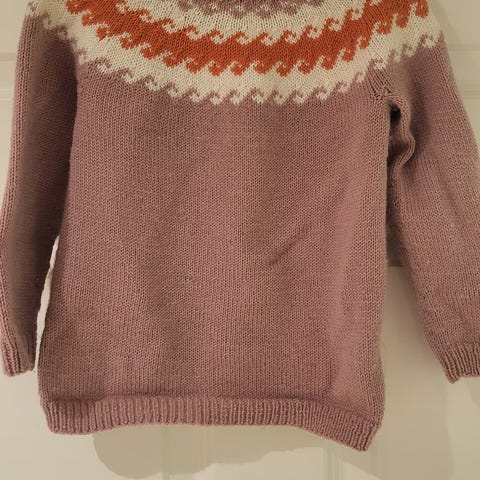 Kun brukt 1 gang. Strikket i viking smart. Hjemmestrikka ullgenser str 104.