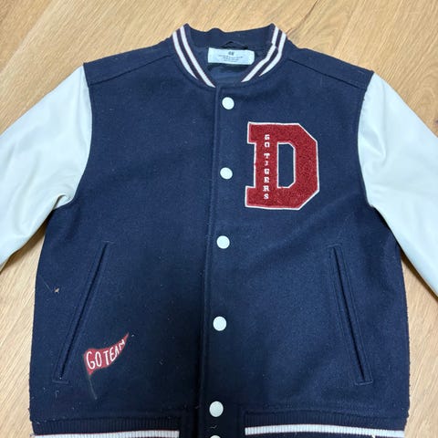 En fin jakke til gutt/jente i str. 122. Det er en liten hull på armen som kan lett fikses med å lime en lapp på.