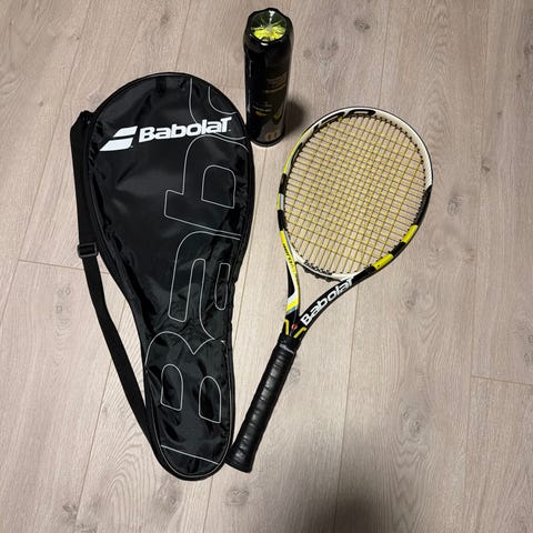 Babolat Eagle String tennisracket med grepstørrelse 2. Racketen har en rød og hvit fargekombinasjon og er designet for tennisspillere. Inkluderer også en boks med tennisballer.