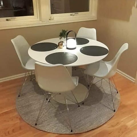 Spisebord Guest fra Skeidar kjøpt i 2024 for 16 000. Hvitpigmentert eikefiner, Ø120.