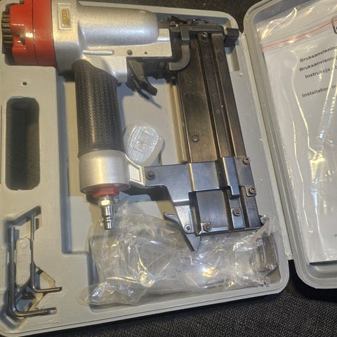 Rapid 34, model B, stiftemaskin (m/ hendel for min - max stille) med tilhørende eske med 5000 stifter. Verktøy sikring KEY-BAK med metall line automatisk tilbakespoling / snelle. To tenger, avisoleringstang, avbiter / avisoleringstang. Fastnøkkel 32 mm. Kraftmeisel, 2 karabinkroker medfølger, pris samlet.