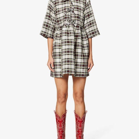 Ganni Silk Stretch Satin Fitted Mini Dress i et svart og gult tie-dye-mønster. Størrelse XS.