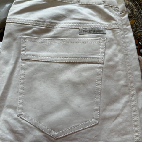 Peak Performance Norman Chinos for dame i størrelse 38. Buksene er beige og laget av 100 % bomull. Modellen er Norman CH med lengde 34, og har to baklommer. 28 i vidde men litt videre i midjen enn andre bukser m 28. Bitte liten sort prikk mellom baklommene - du ser den om du zoomer godt inn.
