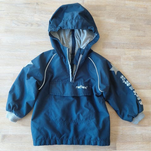 Reflex vinterjakke i størrelse 86, svart farge med oransje innside. Jakken har hette og glidelås foran, samt reflekser på ermene for økt synlighet. Passer for både gutter og jenter.