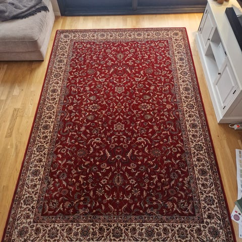 220x150cm persisk gulvteppe. Vintage, Georgia Oriental stil, kjøpt på Iran Import. Finnes ikke i hyllene lenger. Pris for lignende tepper kommer på 5 000-20 000. Vel lagret på loft, og brukes dessverre ikke lenger. Kan leveres eller hentes om du bor i Sandnes-Stavanger området. Pris kan diskuteres.